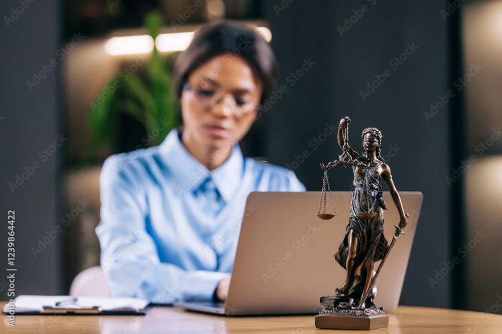 Statue of Justice with scales and a lawyer working on a laptop. Concept: legal consultations and decision-making using modern technology for efficient legal solutions.