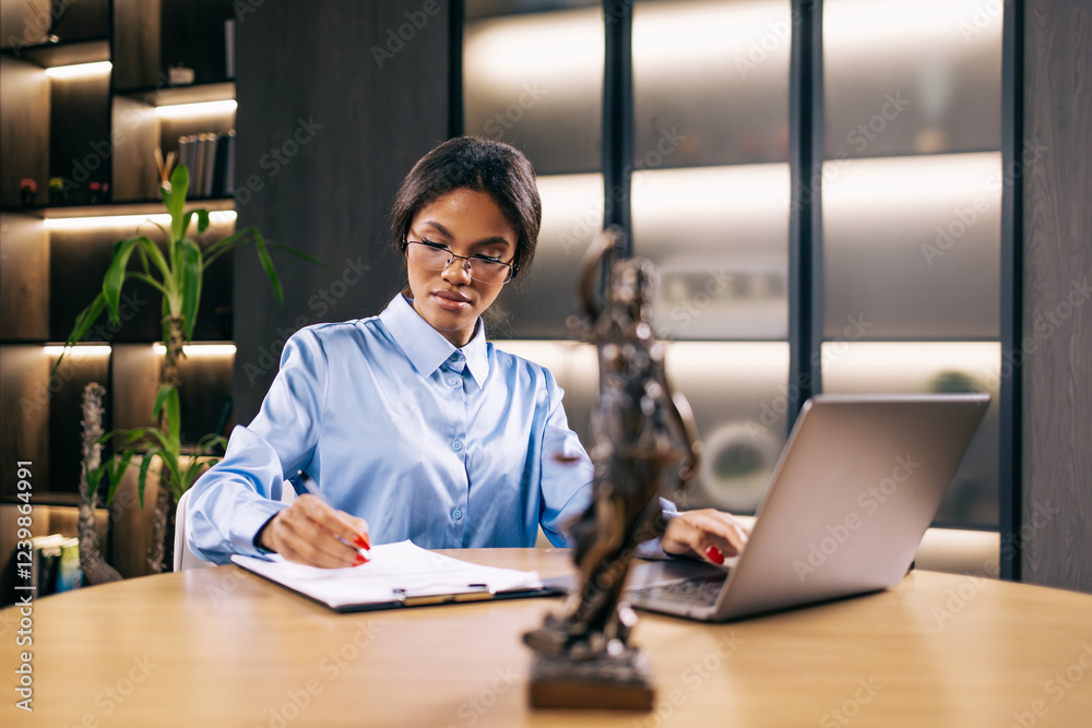 A businesswoman lawyer of African descent working on a laptop with a statue of Lady Justice on her desk. Concept: modern legal practices with a focus on justice and precision.