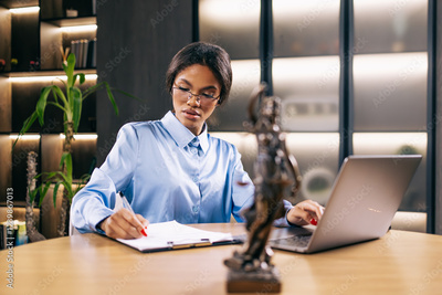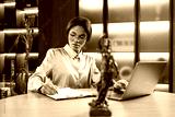 Statue of Justice with scales and a lawyer working on a laptop. Concept: legal consultations and decision-making using modern technology for efficient legal solutions.
