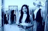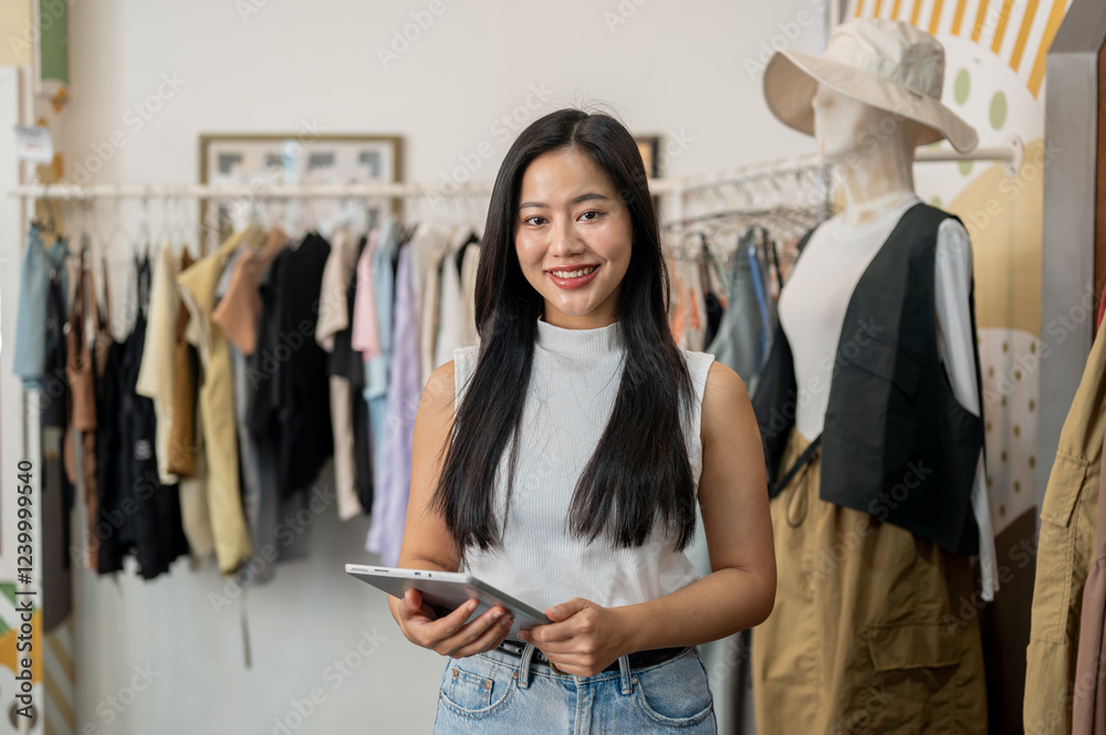 A beautiful Asian female clothing store stands in her store with a digital tablet in her hand.