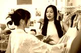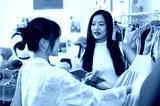 A service-minded Asian female clothing store owner is talking to a customer while she selects items.