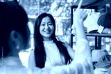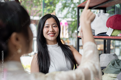 A customer is pointing at the item on the shelf she wants to buy, showing it to a store employee.
