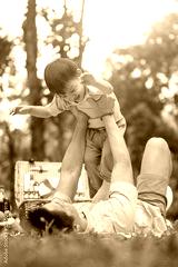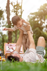 A cheerful little Asian boy is lifted into the sky like an airplane by his dad in a park.