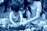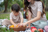 A cute little Asian boy plays with fruits in a basket while picnicking with his mom in a park.