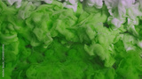 Liquid dye. Water ink surface. Defocused green white color haze cloud vapor texture paint fluid flow on abstract art light background.