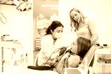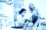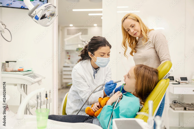 A girl sitting in chair at dentist office and dentist getting tooth work done while girl's mother standing next to them.