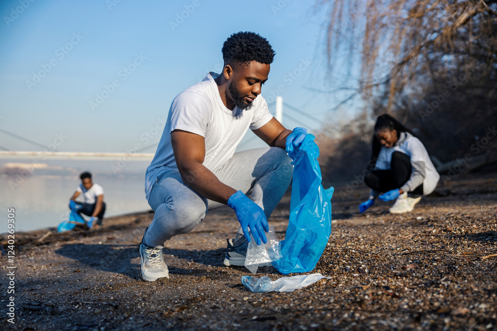 Happy multicultural volunteer putting plastic and paper waste into bag and cleaning riverbank with his eco team.