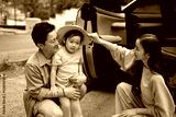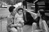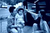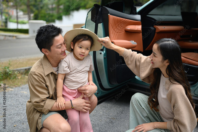 Loving parents dressing their child for an outdoor adventure. Holiday travel concept
