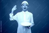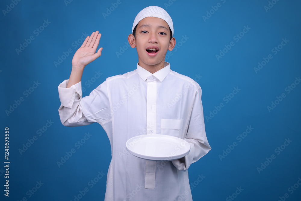 Cheerful Young Asian Muslim Boy Greeting By Waving Hand While Holds Empty Plate Over Blue Background