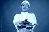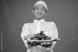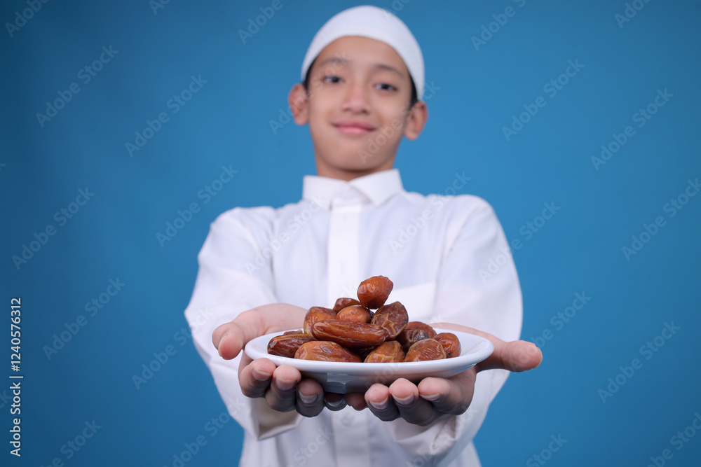 Portrait Of Muslim Teenage Boy Offering Dates Fruit To Front Over Blue Background