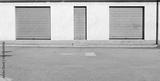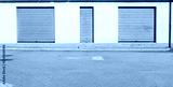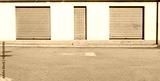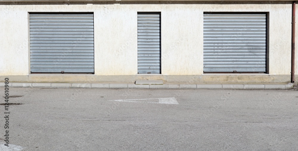 Abandoned shop retail with metal shutters closed . Concrete sidewalk and urban street in front. Background for copy space.