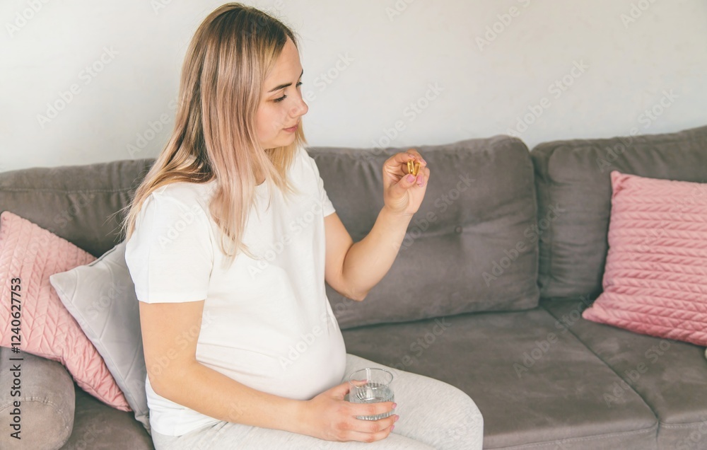 Pregnant woman drinks omega three. Selective focus.