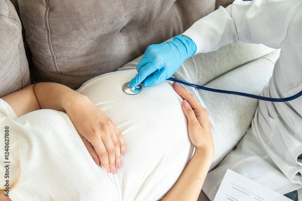 The doctor examines the belly of a pregnant woman. Selective focus.