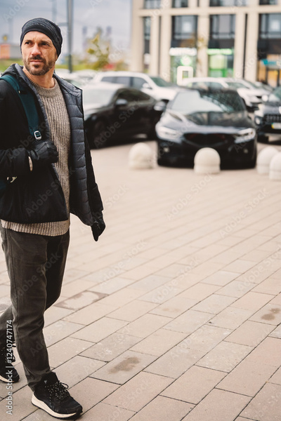 A man with a backpack walks against the background of modern urban architecture. He is dressed in a black autumn jacket and jeans.