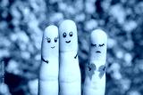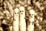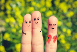 Finger art of Happy couple hugging. Other girl is holding a broken heart. Toned image