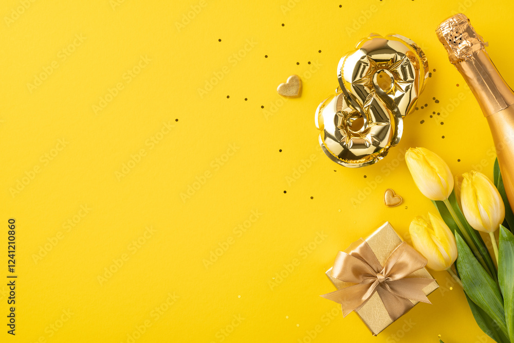 Festive arrangement featuring yellow tulips, a wrapped gift, and gold decorations against a yellow background creating a celebratory and cheerful atmosphere