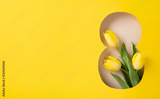 Vivid arrangement of fresh yellow tulips on a vibrant yellow background, symbolizing spring and Women's Day