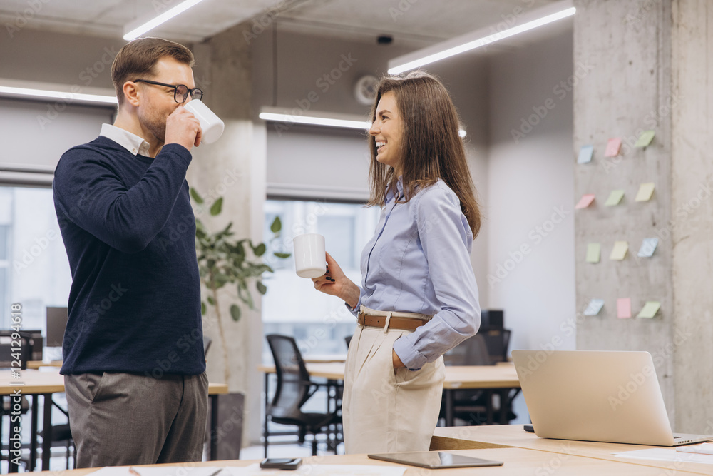 Colleagues drinking coffee and conversing near large windows, sharing ideas in contemporary workplace with natural light streaming inside