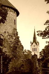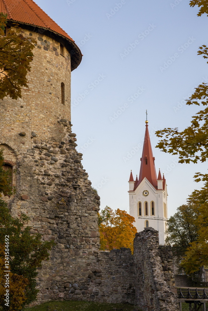 Medieval tower in Cesis, Latvia. Historic stone architecture with autumn foliage