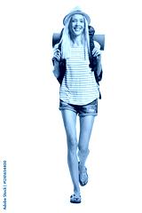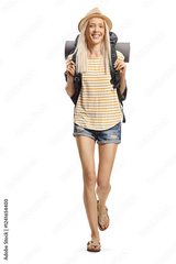 Full length portrait of a female backpacker walking towards camera