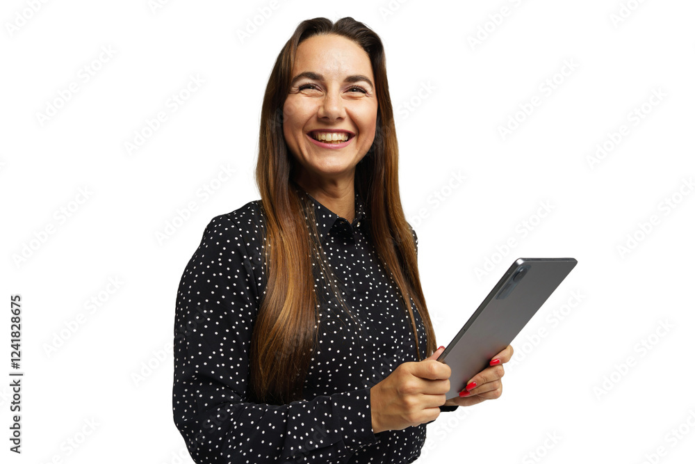 Young woman smiles while holding a tablet and wearing a polka-dot shirt indoors, conveying happiness and engagement