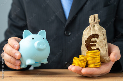 Businessman holds a piggy bank and a bag of money. Putting aside part of the profit for retirement or savings. Wealth management, investment strategies. Pension funds, financial stability