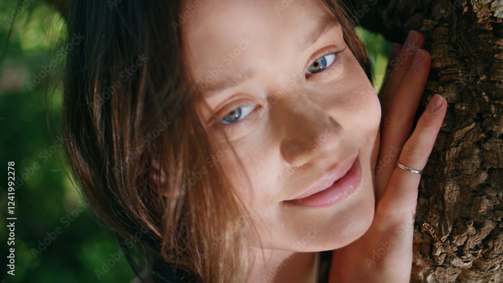 Dreamy girl bonding tree closed eyes at summer forest closeup. Sunshine portrait