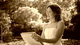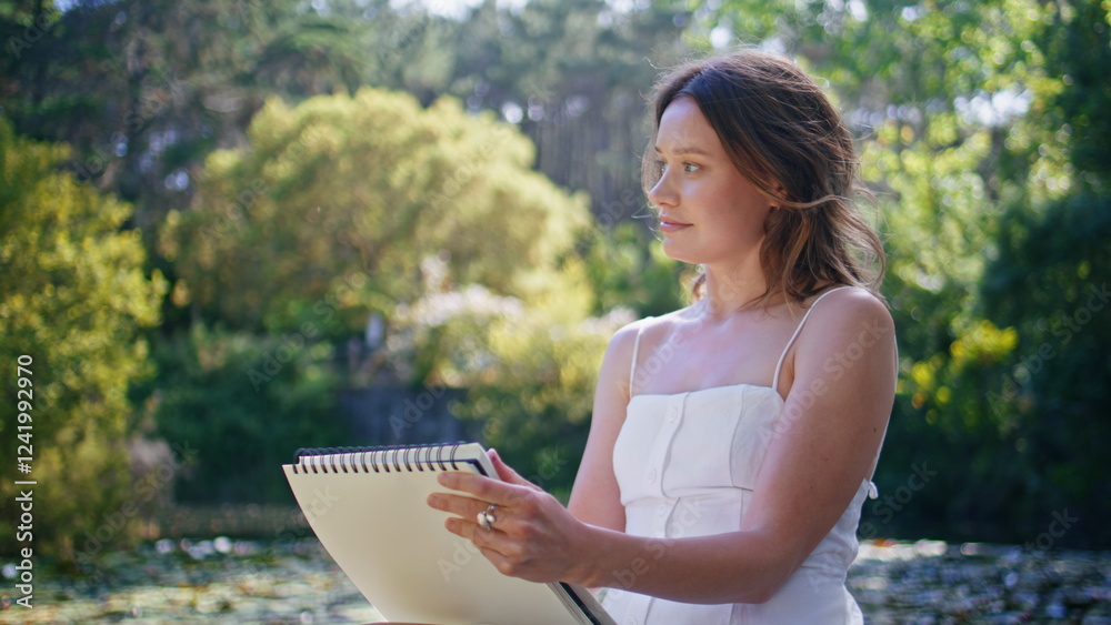 Inspired woman painting lake nature view closeup. Artist relaxing wild jungles