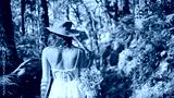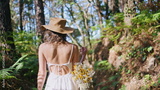Explorer strolling wild forest overlooking green plants back view. Woman walking