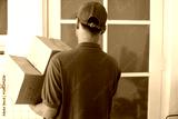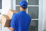 Back View of Deliveryman in Blue Uniform Knocking on Customer's Door