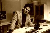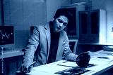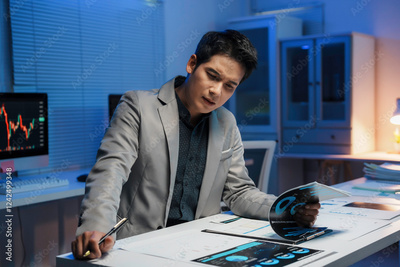 Financial analyst working late examining reports in his office