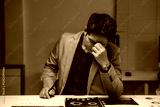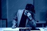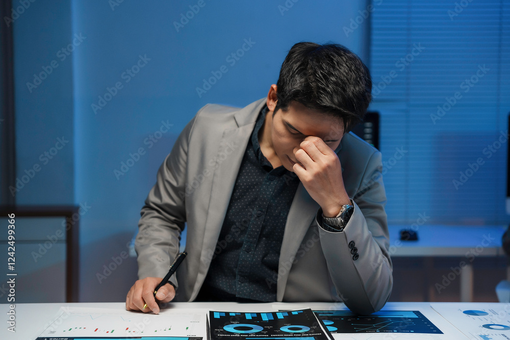 Stressed asian businessman having headache while working late at night in office