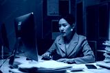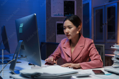 Focused businesswoman working late at night in office using desktop computer