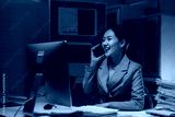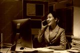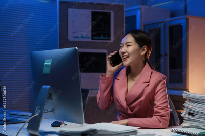 Asian businesswoman talking on phone and smiling while working late at night in office