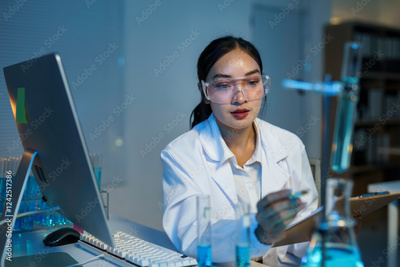 Scientist working with test tubes and taking notes on clipboard in laboratory