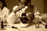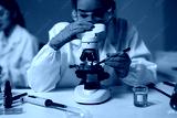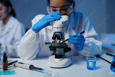 Scientist adjusting microscope slide using tweezers in laboratory
