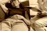 Patient suffering abdominal pain during medical examination with doctor writing notes