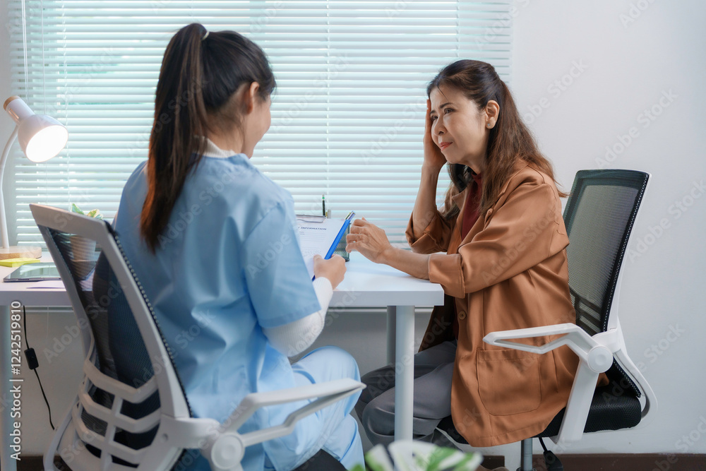 Patient describing symptoms to doctor during medical consultation in clinic