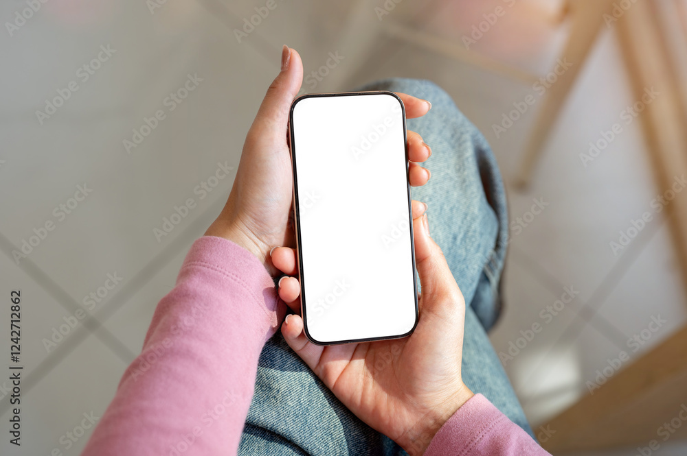 A close-up top view of a woman in jeans sitting indoors and using her smartphone.