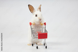 cute rabbit pushing empty shopping trolley cart and looking some food, isolated on white background