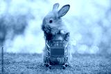 cute rabbit pushing empty shopping trolley cart and looking some food on a green grass