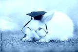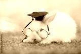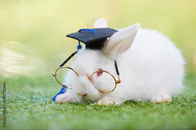 cute white rabbit wearing glasses and graduation cap on a green grass in summer day