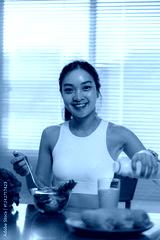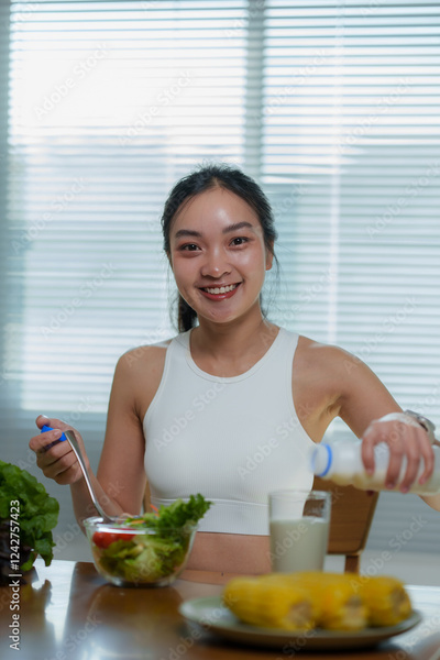 Happy young asian woman pouring milk into a glass and eating fresh vegetable salad in the dining room at home, enjoying a healthy lifestyle and clean food