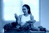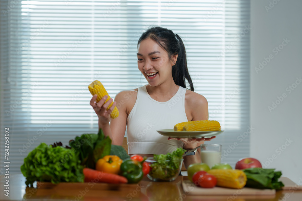Smiling young asian woman holding corn on the cob while sitting at table with variety of fresh vegetables and fruits, enjoying healthy eating habits and promoting balanced diet for wellbeing