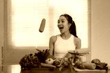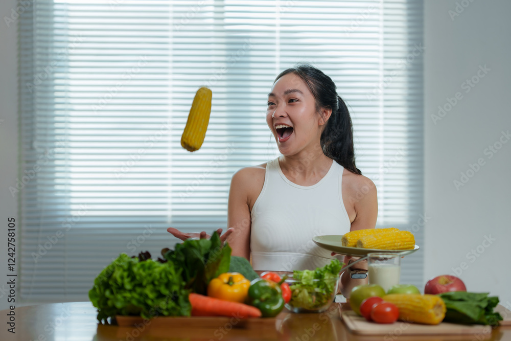 Young woman is playfully juggling a corn cob while sitting at a table filled with fresh fruits and vegetables, enjoying a healthy and vibrant meal at home