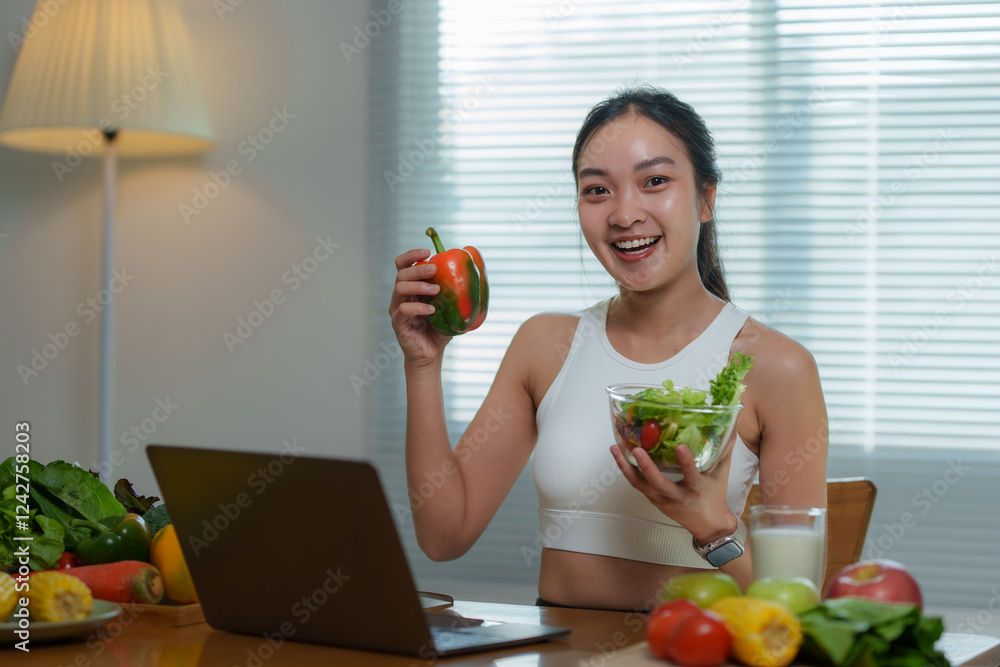 Asian nutritionist holding a bell pepper and a salad bowl while giving online diet consultation using her laptop and smiling at the camera in her modern home office