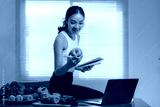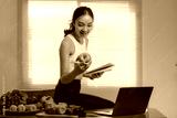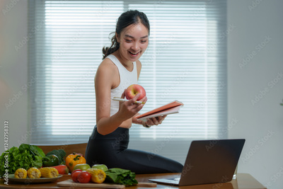 Asian nutritionist holding an apple and reading notes while working on a laptop with fresh vegetables on the table, providing online consultation about healthy eating habits