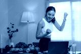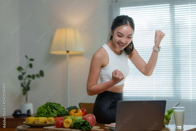 Young nutritionist celebrating success while working from home with a laptop and fresh vegetables, fruits, and healthy food, promoting a healthy lifestyle