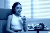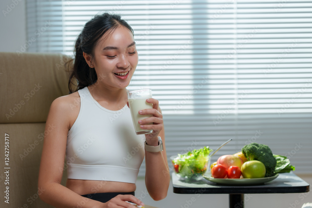 Smiling asian sportswoman drinking milk and eating healthy vegetables and fruits after workout at home, promoting healthy lifestyle and balanced diet