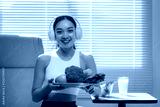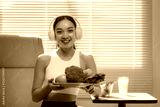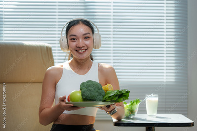 Happy athletic woman wearing headphones and sportswear holding a plate of fresh vegetables and fruit, promoting a healthy lifestyle with a balanced diet